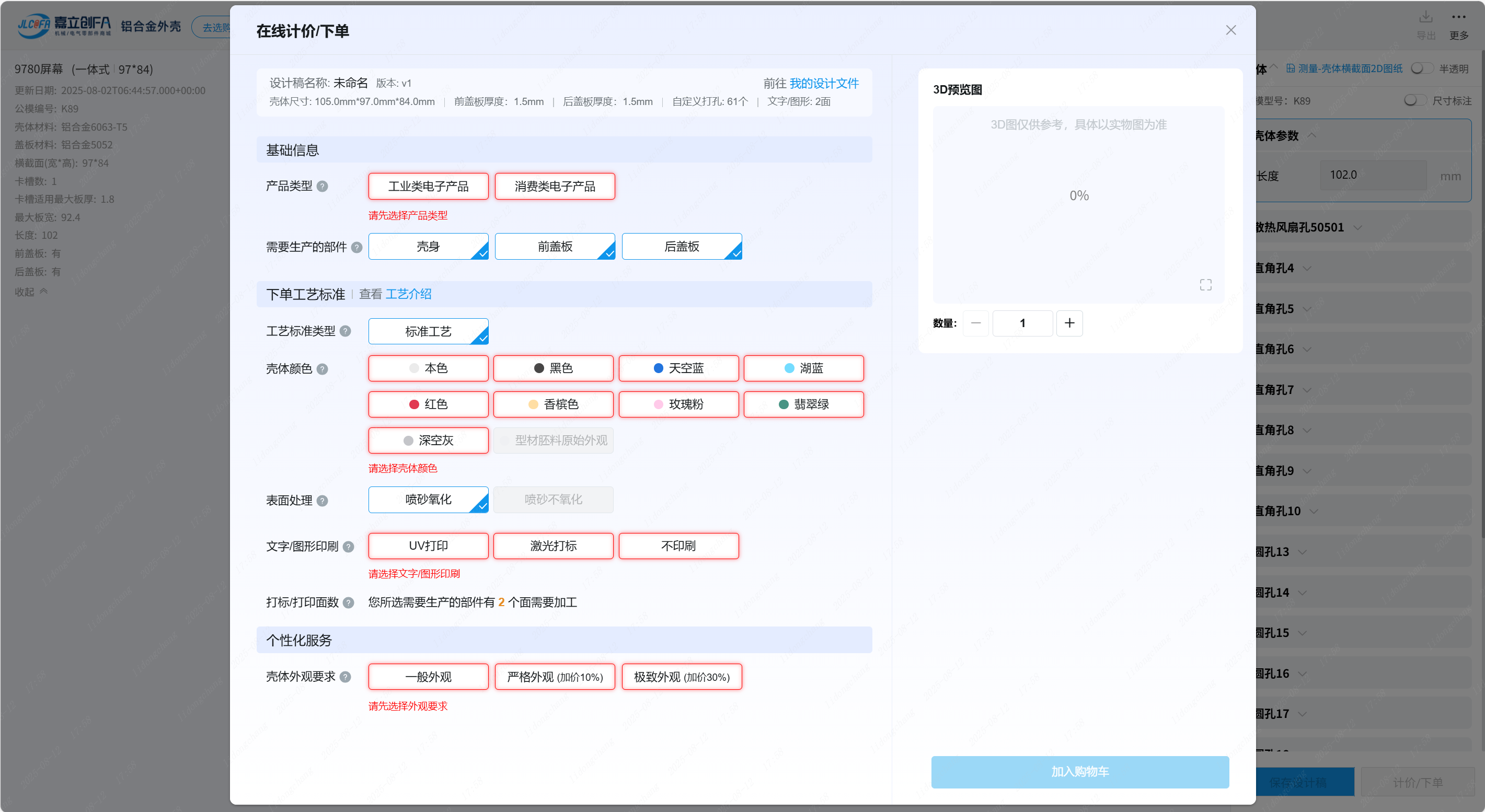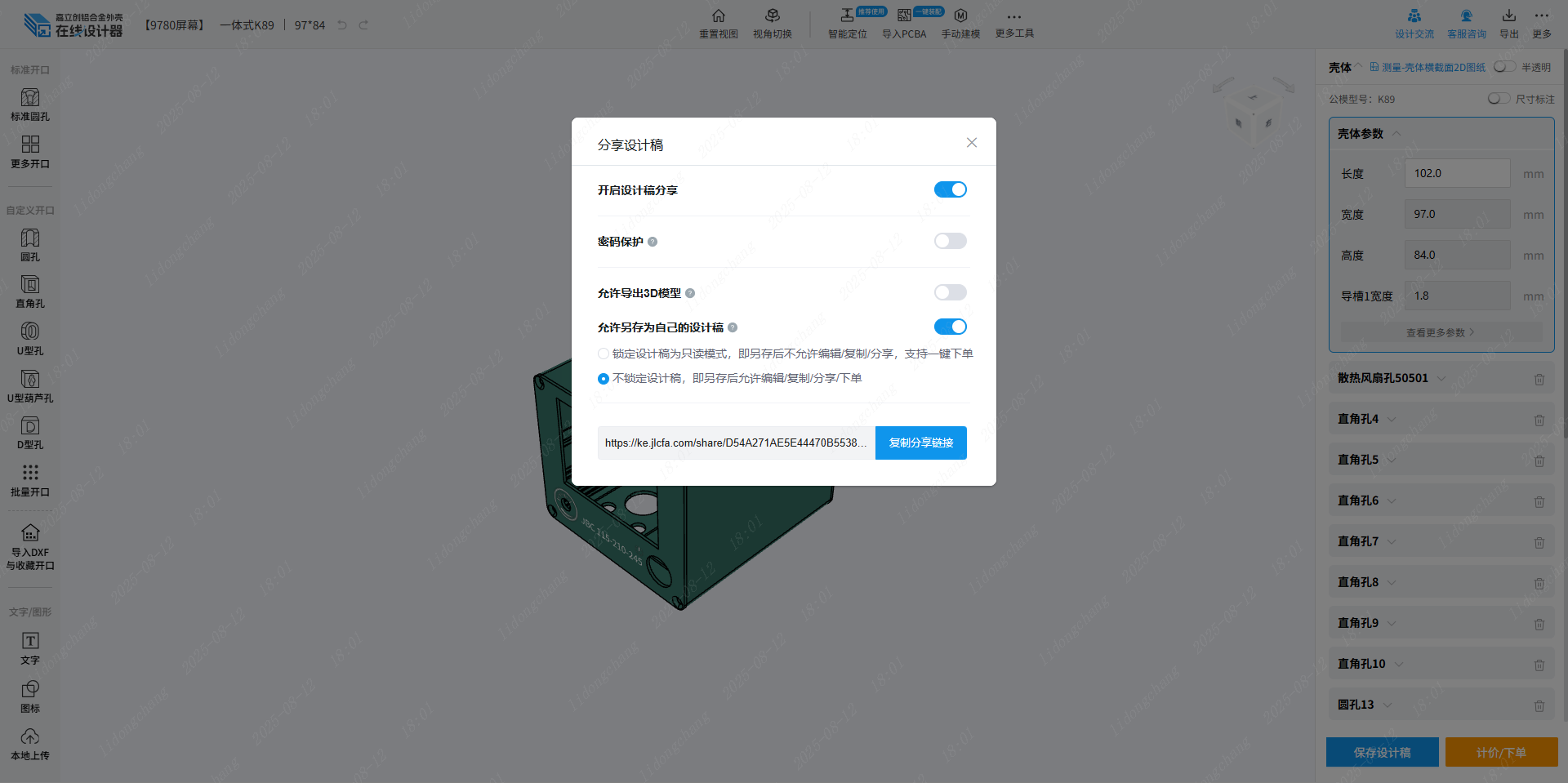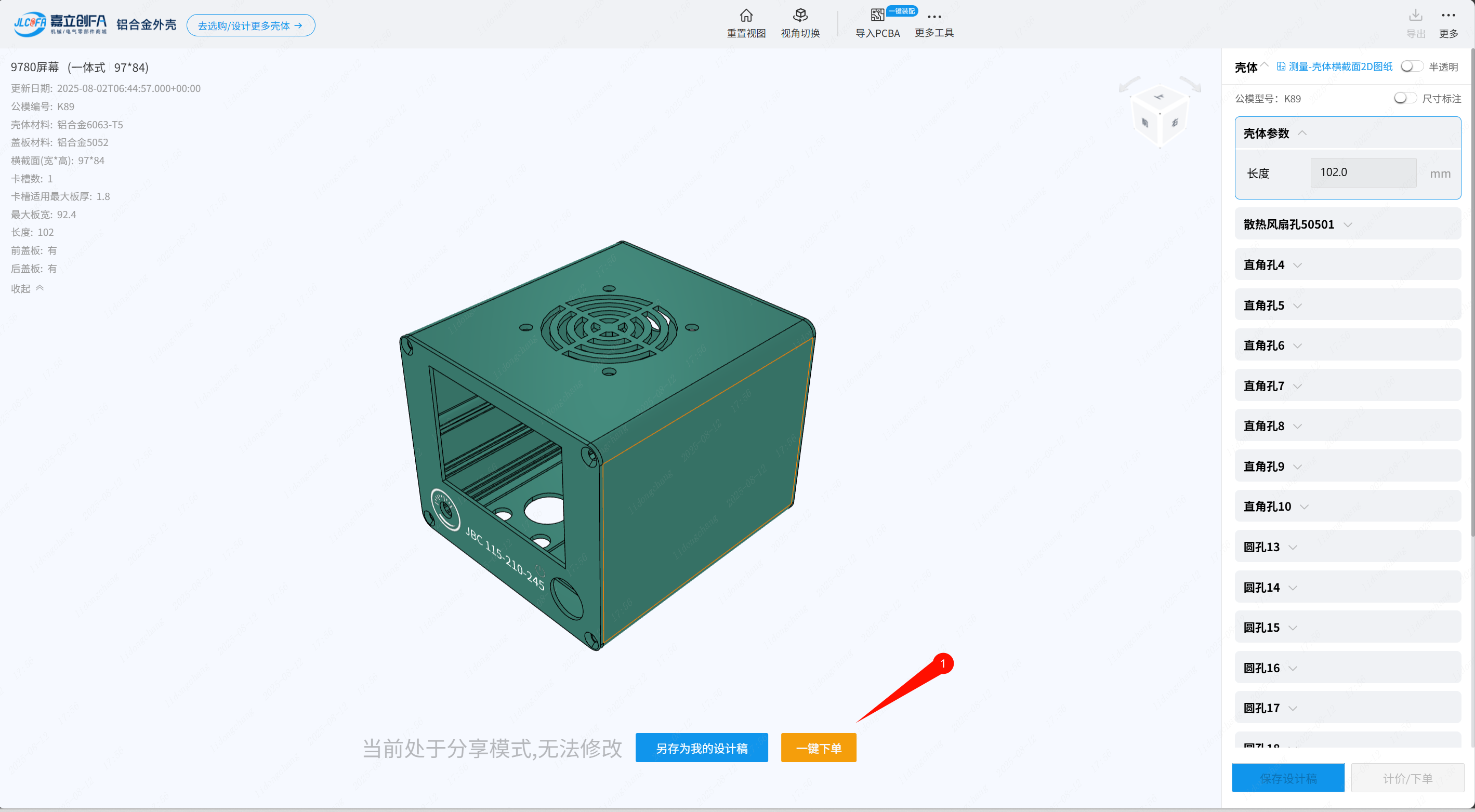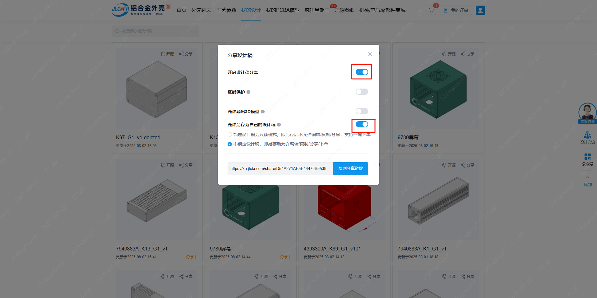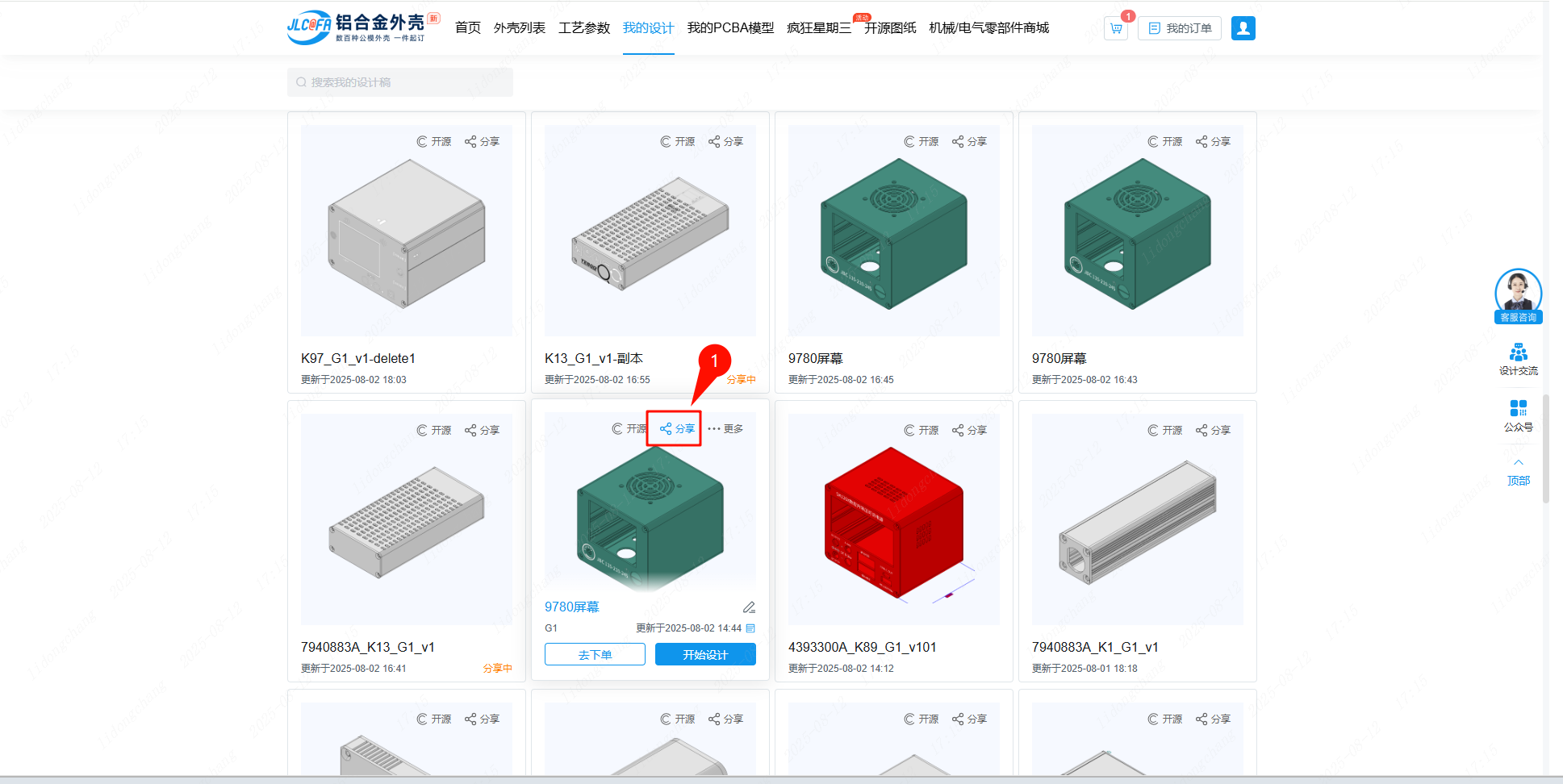 02、打开嘉立创铝合金外壳商城网站,点击“我的设计”,找到需要分享给第三方人员下单的设计稿