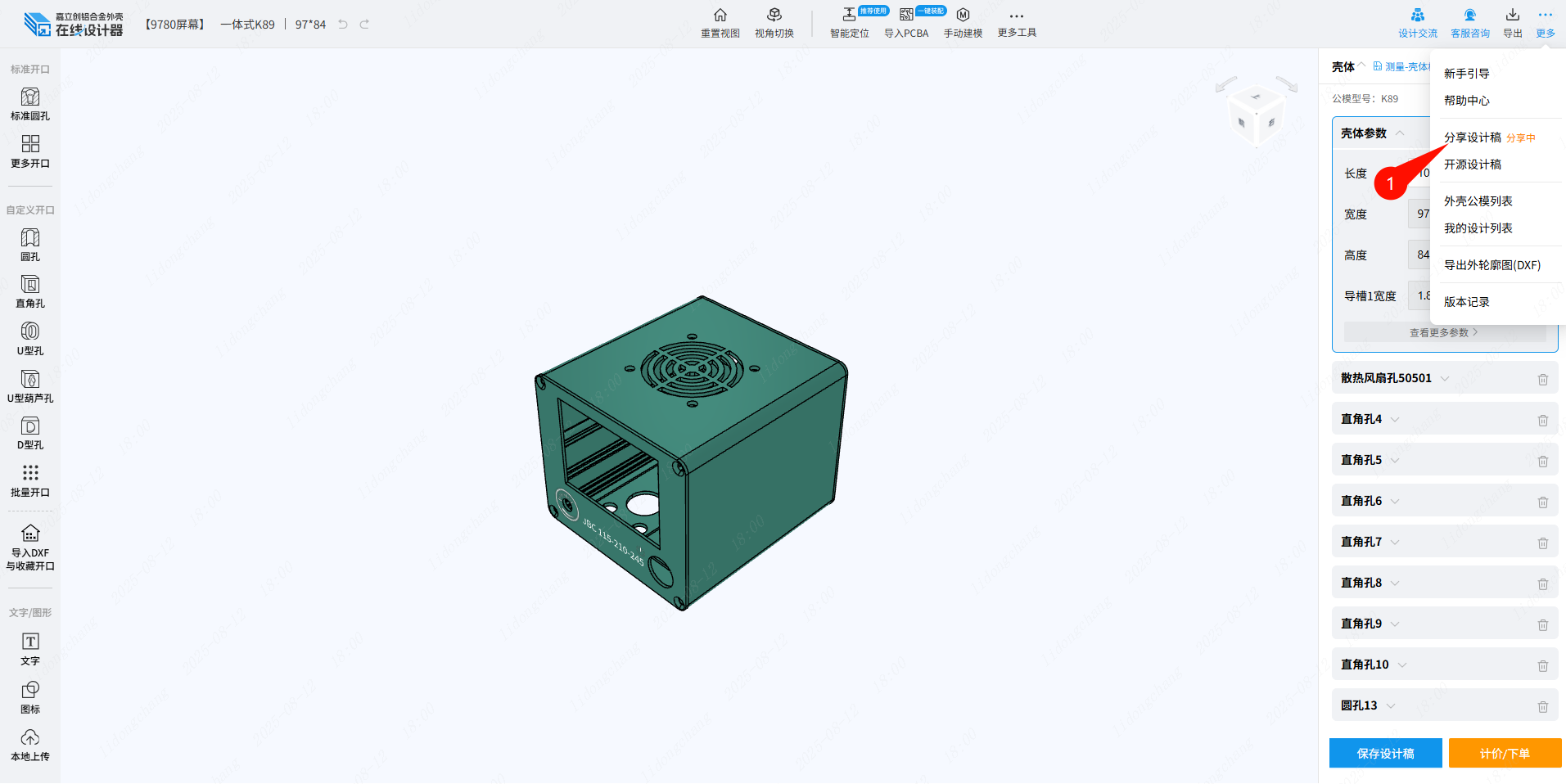 (2)进入设计器进行分享。右上角更多中有“分享设计稿”