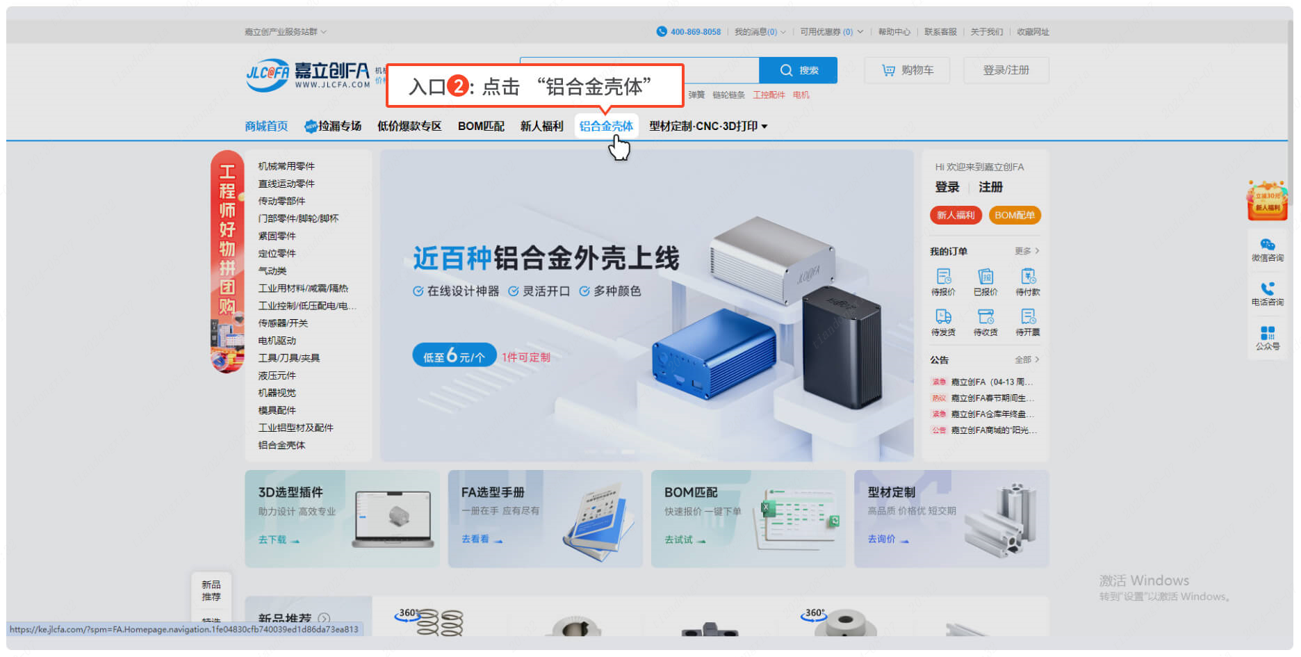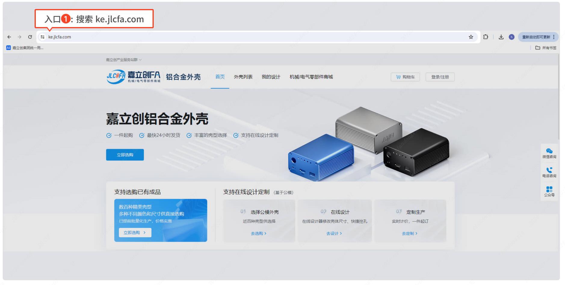01、打开嘉立创铝合金外壳官网:https://ke.ilcfa.com,也可以从【嘉立创FA-机械/电器零部件商城】进入铝合金外壳官网。
